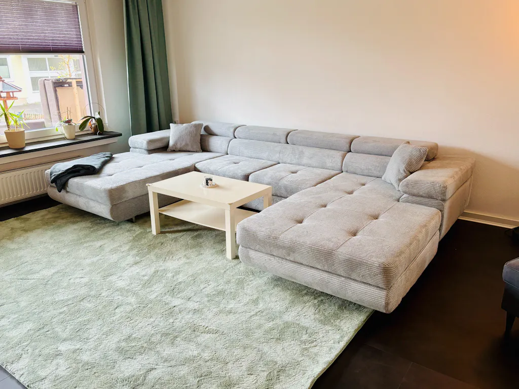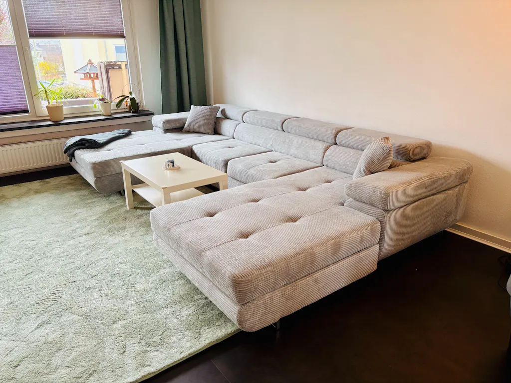 Wir sind absolut begeistert von unserem neuen "Designer Sofa Calvera U mit Schlaf- und Klappfunktion in Cord", das wir bei luxusbetten24.de bestellt haben. Die Entscheidung für die Variante in "Hellgrau / Cord" war ein absoluter Volltreffer, denn sie bildet einen unfassbar eleganten und warmen Kontrast zu unserem neuen, dunklen anthrazitfarbenen Vinylboden, was dem gesamten Raum sofort eine gemütliche und moderne Atmosphäre verleiht.